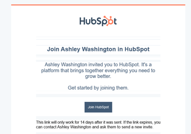 1. You should receive an email from noreply@hubspot.com with the subject: Ashley Washington has invited you to join them on Hubspot
