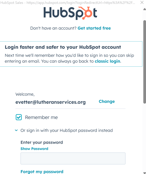 5. Then, you will be logged into HubSpot with the below user page- click “Remember Me” to remember that device and again input your unique password (Do NOT click to sign in via Google/Microsoft etc. as you will run into a CITI admin requirements issue).
